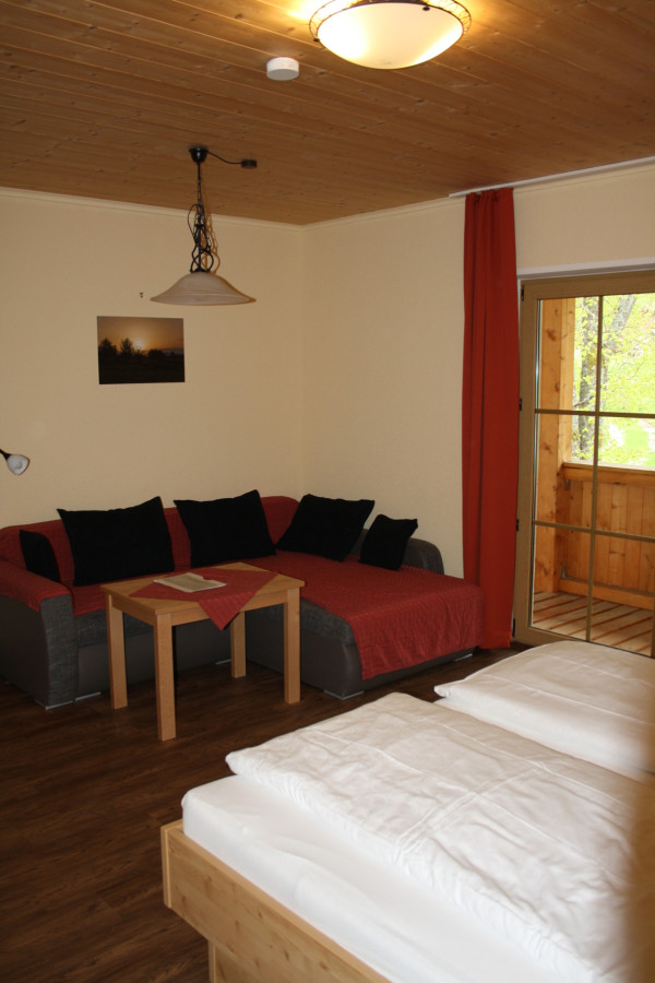 Unser Doppelzimmer ist ca. 35qm groß und ist ausgestattet mit Doppelbett, Sofa, Bad mit Dusche/WC und Balkon