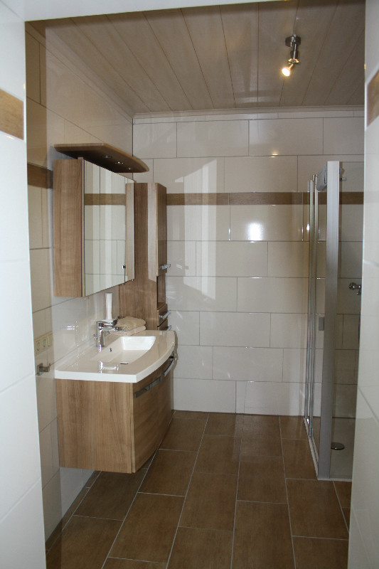 Das Bad ist ausgestattet mit einem Waschtisch, Toilette und einer 90x110 Dusche