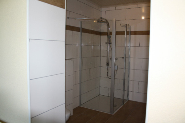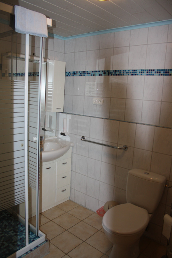 Das Bad ist ausgestattet mit einem Waschtisch, Toilette und einer 90x90 Dusche