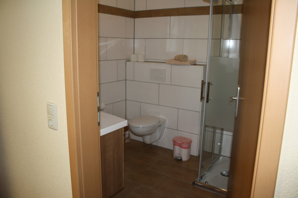 Das Bad ist ausgestattet mit einem Waschtisch, Toilette und einer 90x110 Dusche